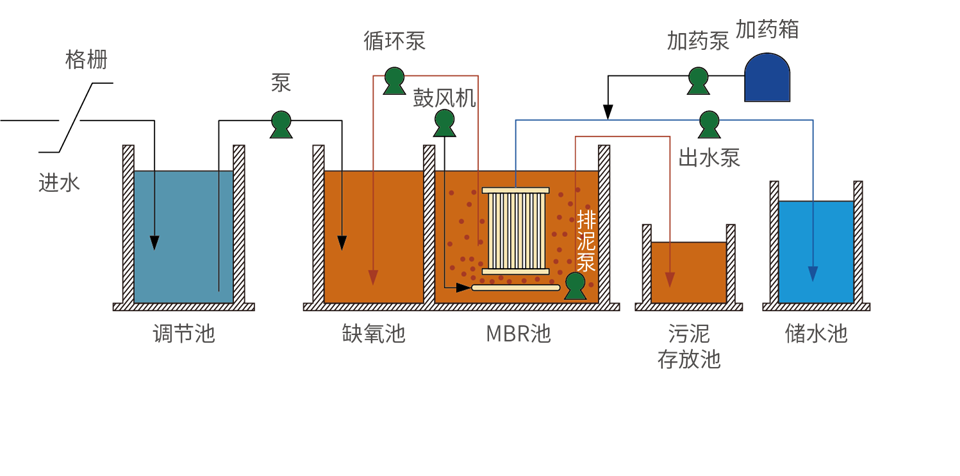 MBR工藝是一種將高效膜分離技術(shù)與傳統(tǒng)活性污泥法相結(jié)合的新型高效污水處理工藝,它將具有獨(dú)特結(jié)構(gòu)的MBR膜組件置于曝氣池中,經(jīng)過好氧曝氣和生物處理后的污水,由泵通過濾膜過濾后抽出。它利用膜分離設(shè)備將生化反應(yīng)池中的活性污泥和大分子有機(jī)物質(zhì)截留住,省掉二沉池。活性污泥濃度因此大大提高,水力停留時(shí)間(HRT)和污泥停留時(shí)間(SRT)可以分開控制,使難降解的物質(zhì)回流至反應(yīng)器中不斷反應(yīng)、降解。由于MBR膜大大提高了系統(tǒng)固液分離的能力,從而使系統(tǒng)出水水質(zhì)和容積負(fù)荷都得到大幅度提高,經(jīng)膜處理后的出水水質(zhì)優(yōu)于國家一級A標(biāo)準(zhǔn),經(jīng)消毒后可直接作為新生水源。